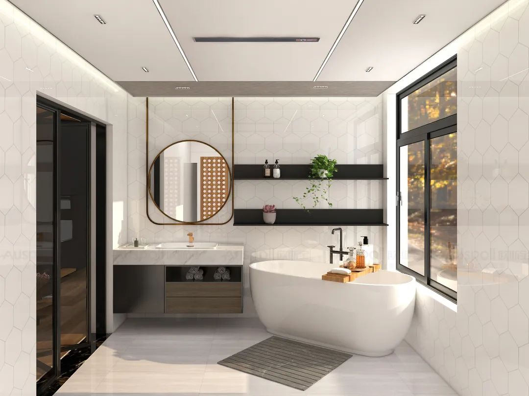 星际浴室空调,80×900mm极简线型设计,搭配无界大板吊顶,线条美爆棚,极简高级又耐看。