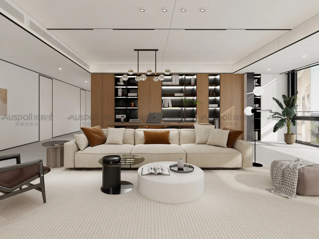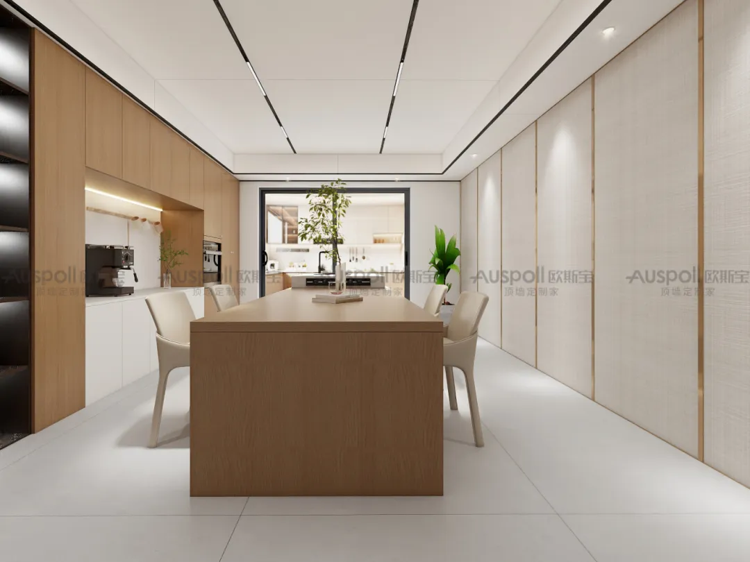 选择线条简洁家具,避免过多的装饰和复杂的线条,以保持空间的简洁。利用光和木背景墙+无主灯,质感高级,更有自然感。