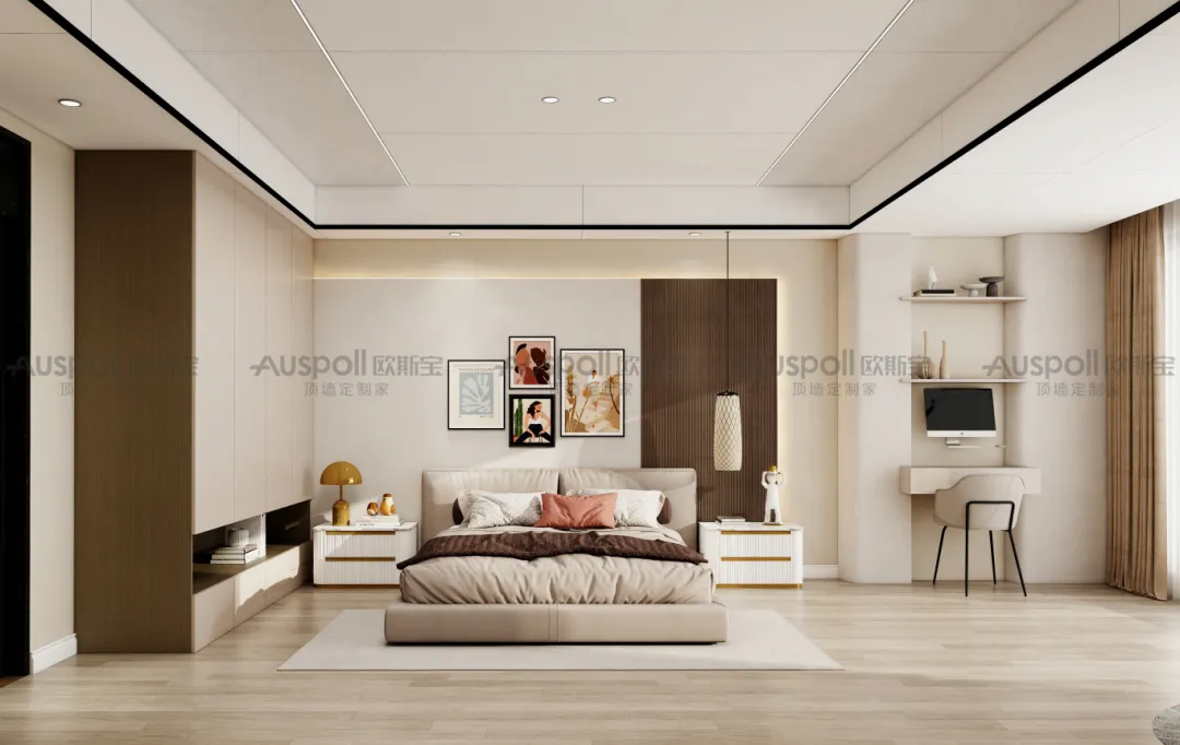 卧室是休息和放松的空间,主卧柔和色调设计,带来舒适温馨感。