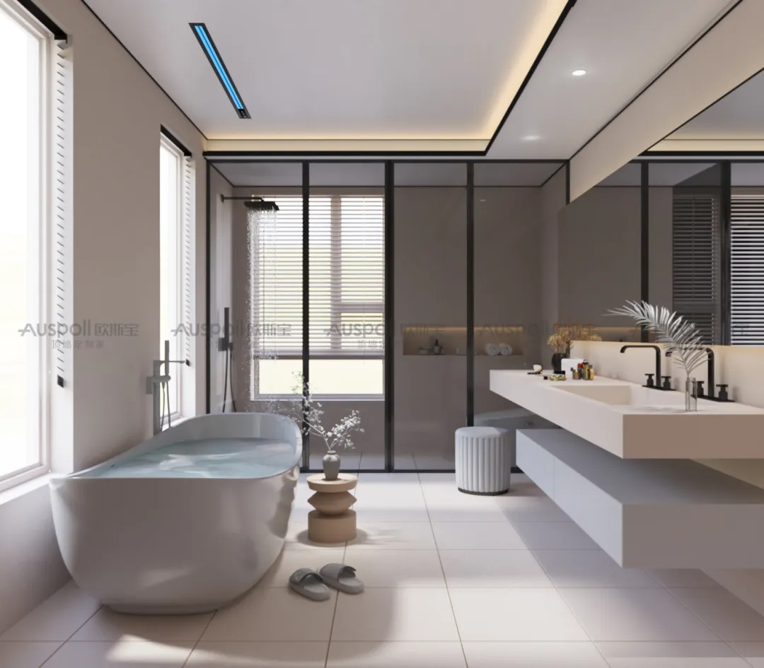 墙面整铺浅色瓷砖,吊顶用蜂窝大板,防潮防霉,隐藏管道,搭配小火星浴室暖空调,一年四季舒适沐浴。