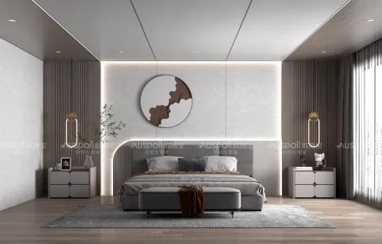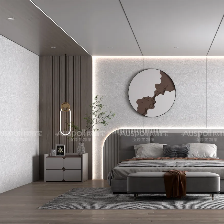 卧室背景墙采用c7电子娱乐登录入口木饰板+格栅在灯光的烘托下,意境悠远,强化了自然纹理的细节质感,让墙面更具层次感和艺术感。再搭配上灯带,增添一种灵动而轻盈的视觉效果。