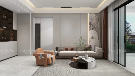 作为家庭活动的中心,客厅的背景墙设计尤为重要。大理石纹的冷硬质感与木饰板温暖质朴相结合,不仅增加了视觉层次感,也营造出一种既高级又不失自然气息的空间环境。